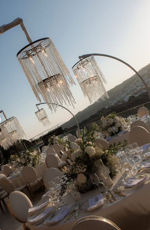 16. Glam Outdoor Spring Wedding Reception with Crystal Chandeliers & Sunset Views