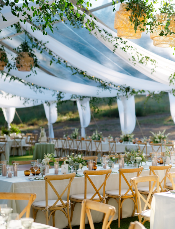 It’s the perfect blend of rustic charm and modern simplicity under a dreamy tented space.