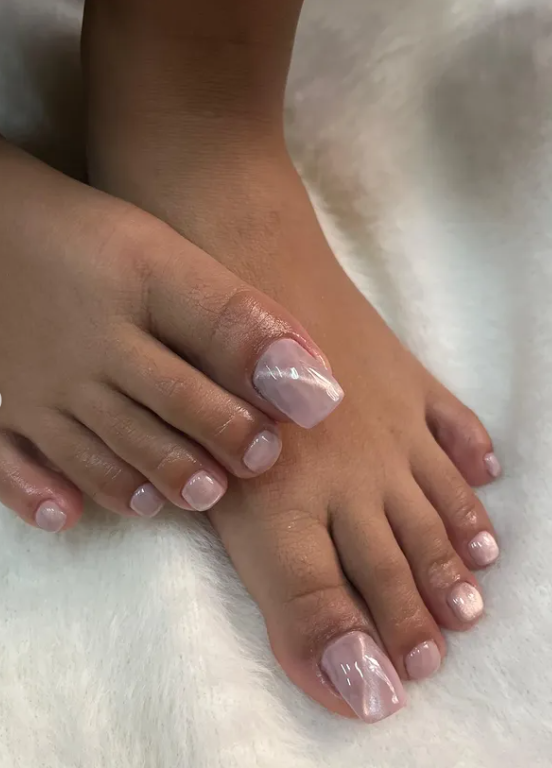 This soft blush pink pedicure is effortlessly elegant and perfect for a natural bridal style.