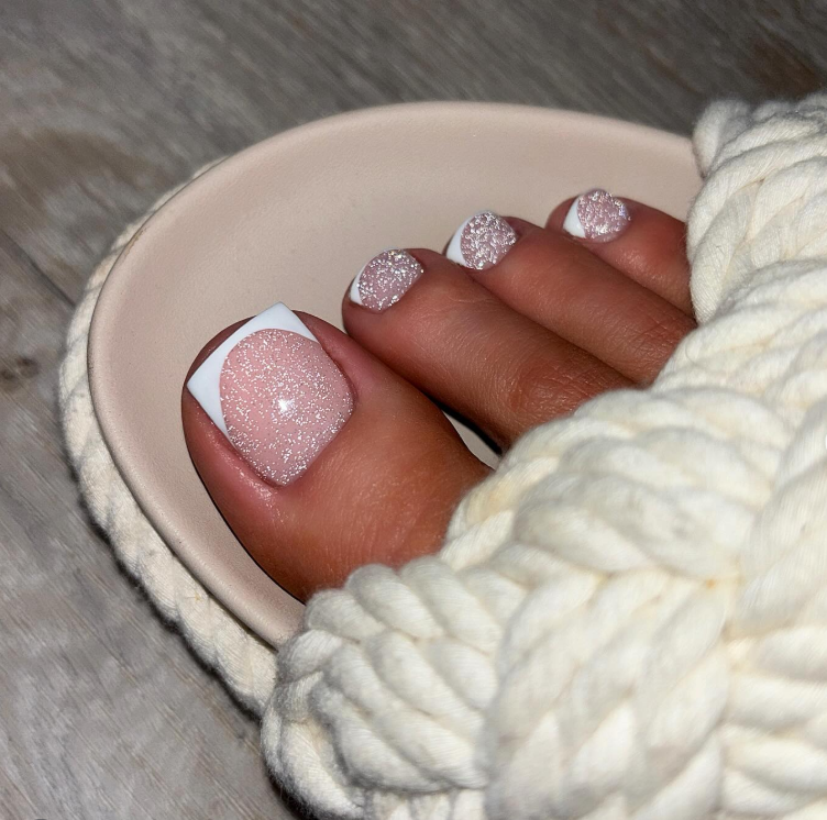 5. Glitter French Tip Wedding Toe Nails for a Soft Bridal Sparkle