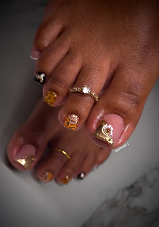This gold-accent pedicure is all about luxury and detail.