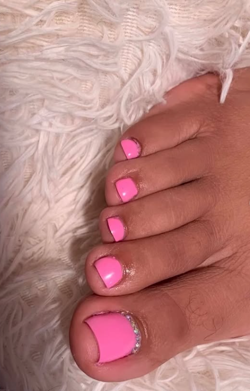 18. Bright Pink Wedding Toe Nails with Rhinestone Accent